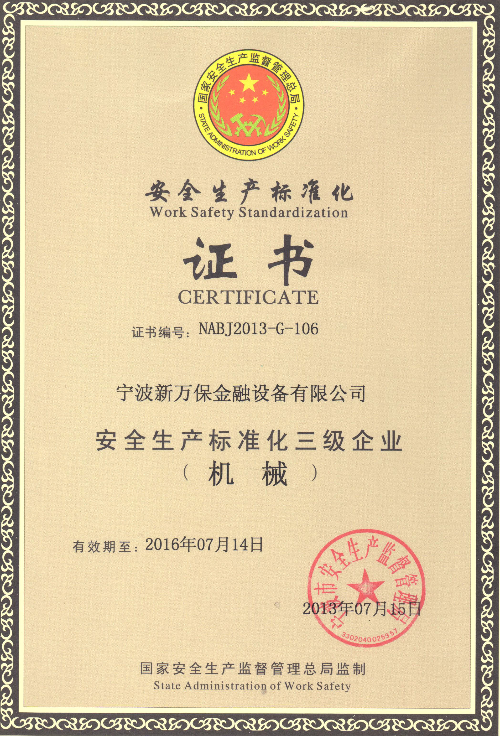 安全標(biāo)準(zhǔn)化生產(chǎn)三級企業(yè)證書