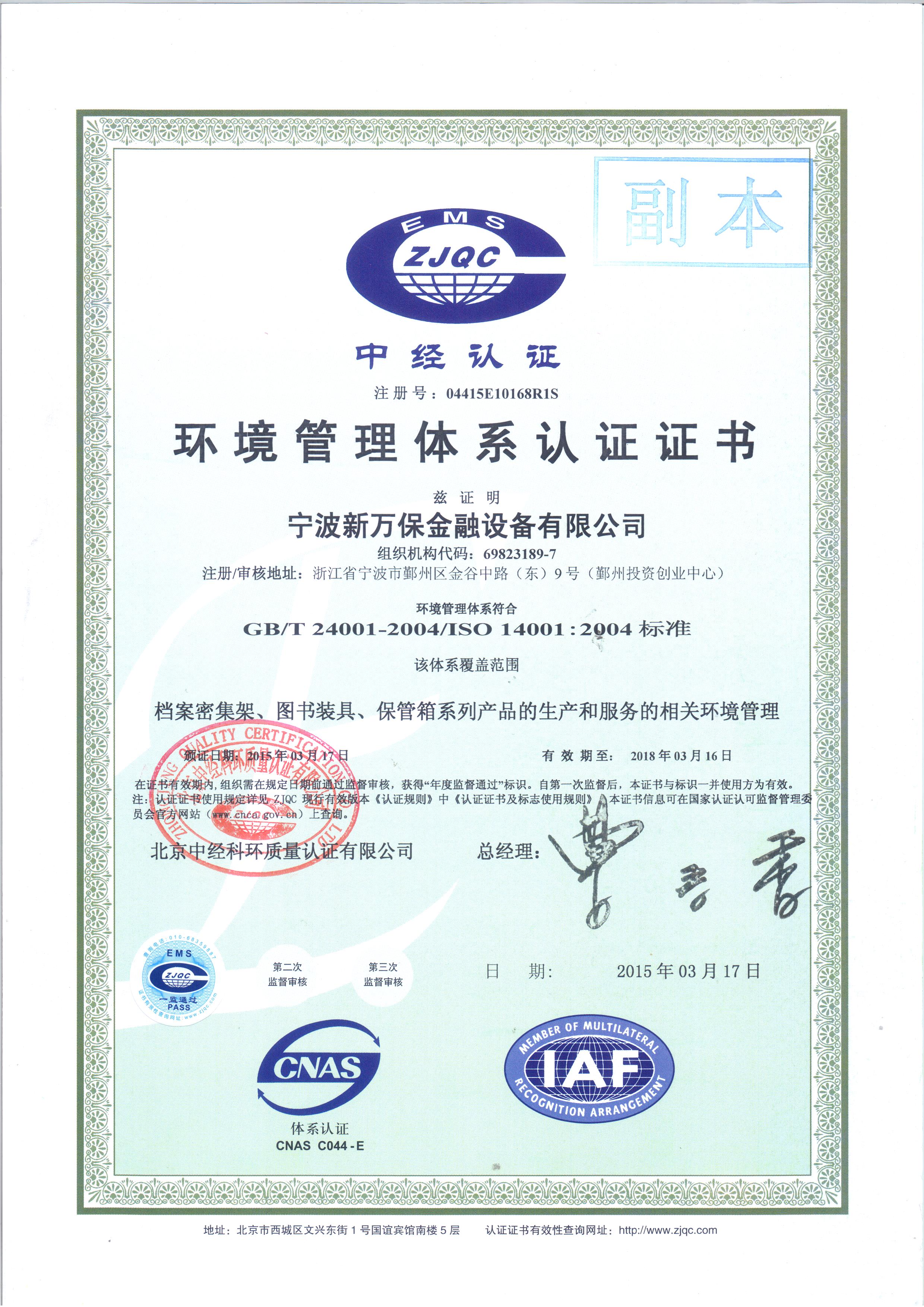 環(huán)境管理體系認(rèn)證證書