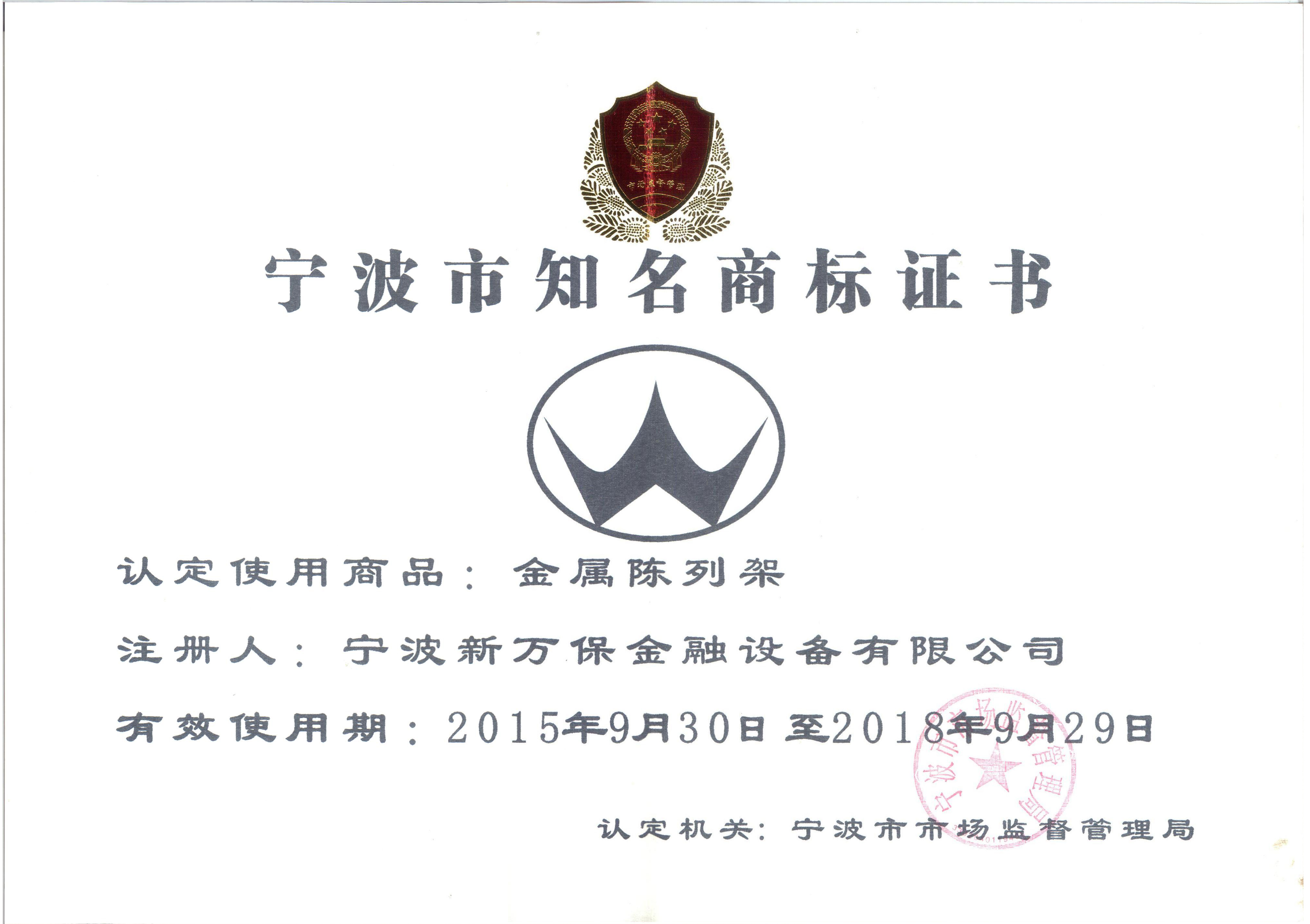 寧波市知名商標(biāo)證書