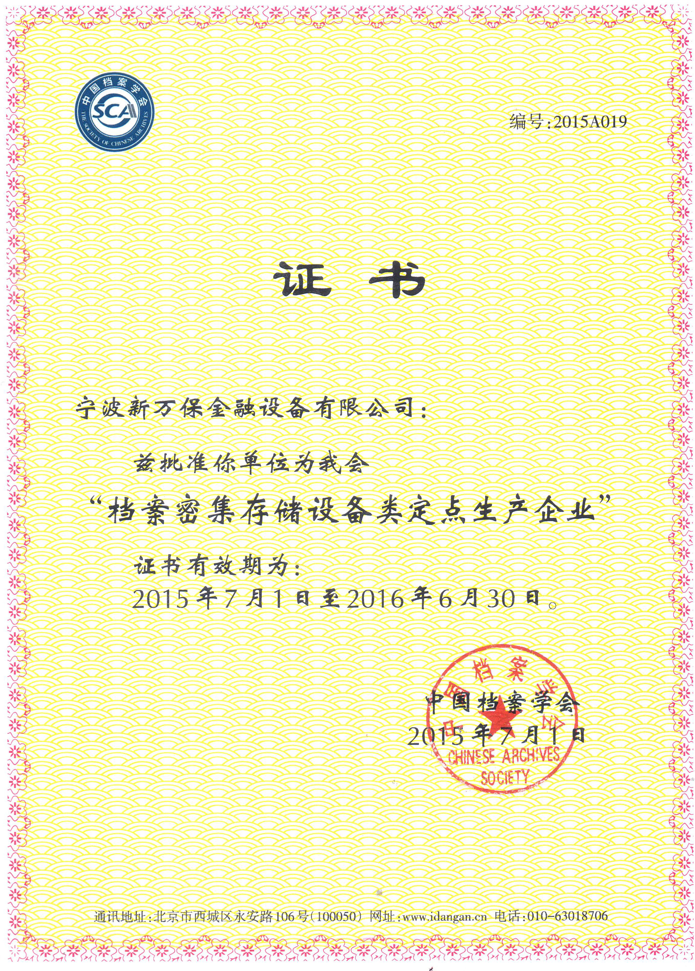 中國檔案學(xué)會定點(diǎn)生產(chǎn)企業(yè)證書