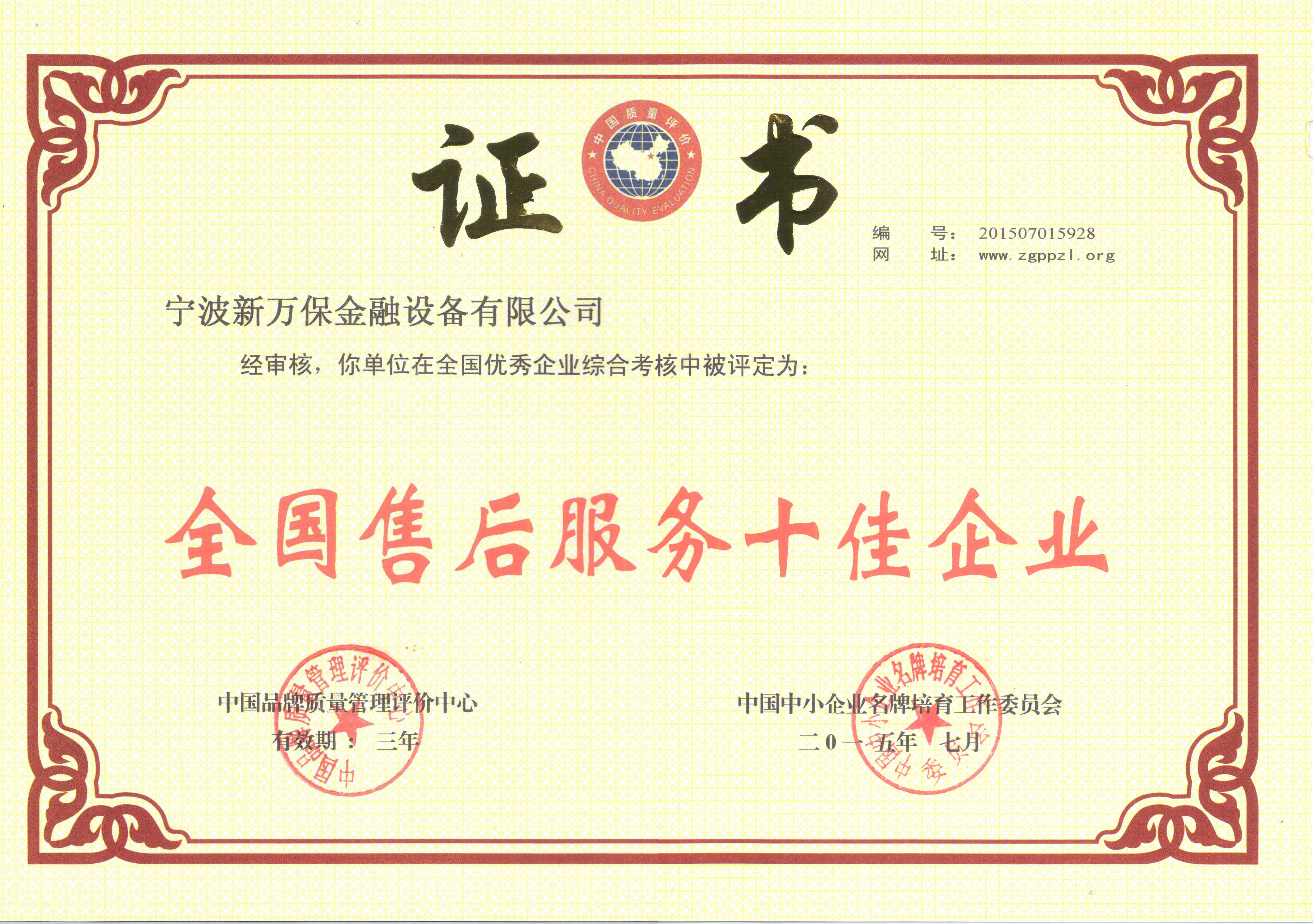 全國售后服務(wù)十佳企業(yè)證書