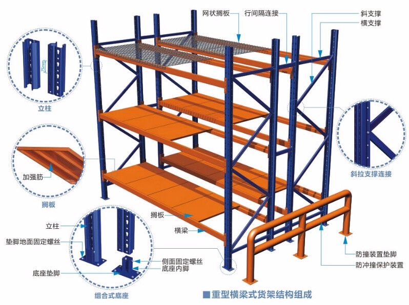 重型橫梁式貨架又稱貨位式貨架、托盤式貨架。貨物置于托盤之上,由叉車進(jìn)行存取貨物,存放方便靈活。適合存放多品種、大批量的各種產(chǎn)品;且承載能力大,每層最大承載可達(dá)2000kg,孔距75mm可上下調(diào)節(jié)。廣泛應(yīng)用于制造業(yè)、第三方物流業(yè)、配送中心、倉儲式超市等高位倉庫領(lǐng)域。